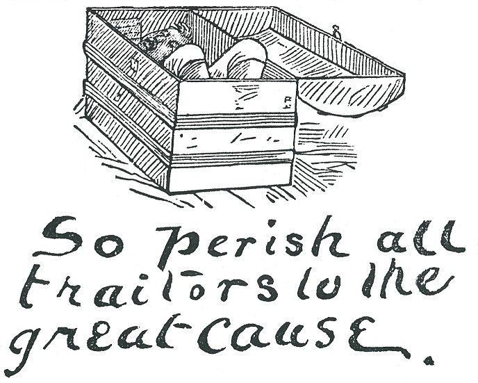 Bondsmen put up Buchanan’s bail. He thanked them by vanishing like a shade and leaving them holding the bag. The one-time physician faked his own drowning and fled to Canada. He did this not only to escape the law, but also to cheat his bondsmen. But Buchanan proved better at shamming sheepskins than hiding from the authorities. On August 24, he turned up in Windsor, Ontario, cowering under the alias Fairchild. On September 10, he worked up the courage to cross into the USA and was quickly arrested at St. Clair, Michigan.